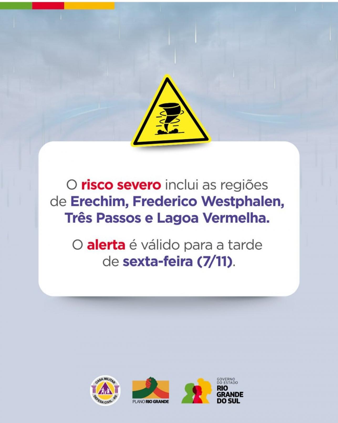 Defesa Civil do Rio Grande do Sul atualiza a previsão para os próximos dias: a formação de um ciclone extratropical pode provocar tempestades severas, com risco de tornados e rajadas de vento fortes nas regiões Noroeste, Norte e Nordeste. Também há risco de chuva volumosa, ventos acima de 100 km/h, granizo e descargas elétricas.