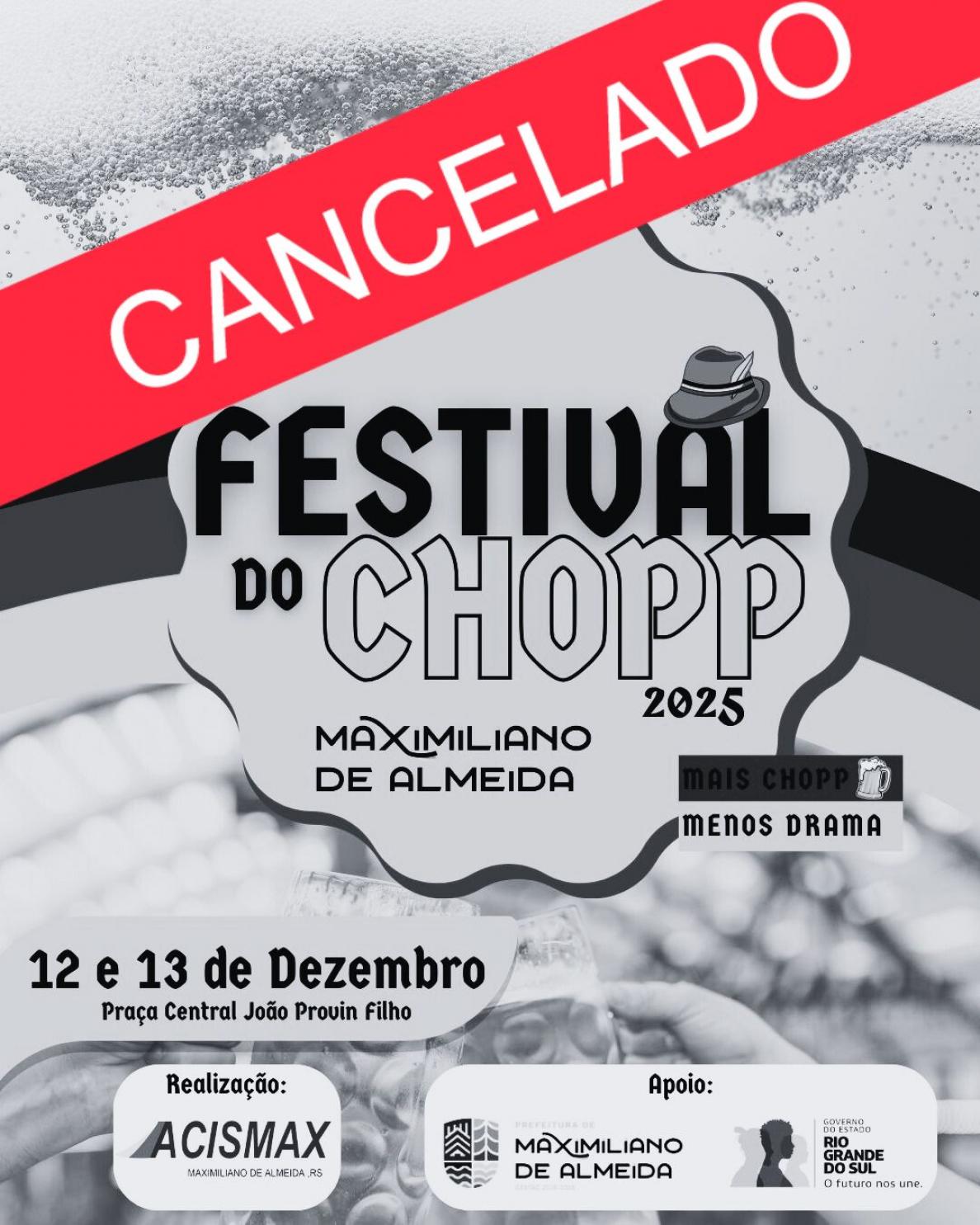 A Administração Municipal de Maximiliano de Almeida informa, com transparência e respeito à comunidade, o CANCELAMENTO do Festival do Chopp, que aconteceria nos dias 12 e 13 deste mês.