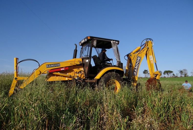 Secretário da Agricultura, Sergio Bernardi, acompanha os primeiros serviços da retro escavadeira que o município de Maximiliano de Almeida recebeu do Programa PAC 2 do Governo Federal.
