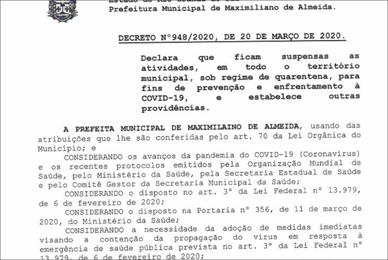 Através do Decreto Municipal nº 948 em enfrentamento ao Coronavírus, fica estabelecido que estão suspensas no município as atividades não essenciais até o dia 29 de março.