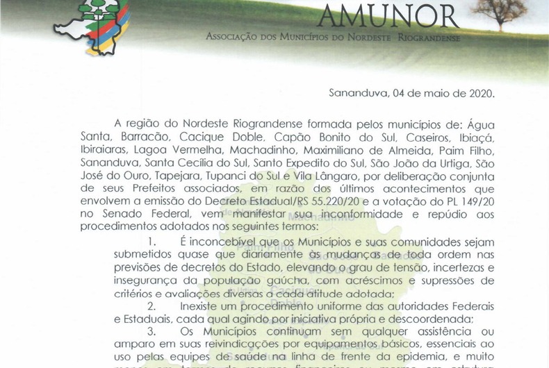 A região do Nordeste Riograndense formada pelos municípios de: Água Santa, Barracão, Cacique Doble, Capão Bonito do Sul, Caseiros, Ibiaçá, Ibiraiaras, Lagoa Vermelha, Machadinho, Maximiliano de Almeida, Paim Filho, Sananduva, Santa Cecília do Sul, Santo Expedito do Sul, São João da Urtiga, São José do Ouro, Tapejara, Tupanci do Sul e Vila Lângaro, por deliberação conjunta de seus Prefeitos associados, em razão dos últimos acontecimentos que envolvem a emissão do Decreto Estadual/RS 55.220/20 e a votação do PL 149/20 no Senado Federal, vem manifestar sua inconformidade e repúdio aos procedimentos adotados nos seguintes termos: