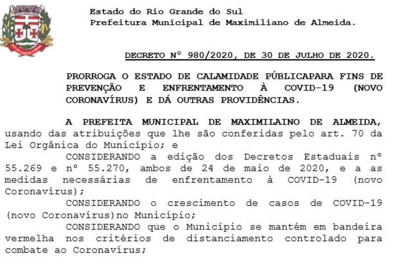 Art. 1º - Fica prorrogado até 31 de agosto de 2020 o estado de calamidade pública em todo o território do Município de Maximiliano de Almeida, declarado para fins de prevenção e enfrentamento à COVID-19 (novo Coronavírus).