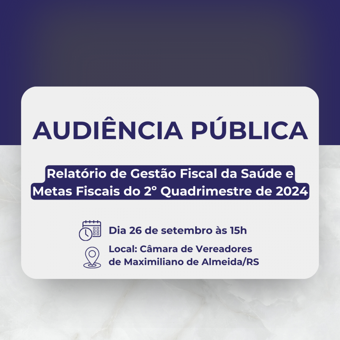 A Prefeitura Municipal de Maximiliano de Almeida convoca a população para participar da Audiência Pública sobre o Relatório de Gestão Fiscal da Saúde e Metas Fiscais do 2º Quadrimestre de 2024. O evento ocorrerá no dia 26 de setembro, às 15h, na Câmara de Vereadores. É uma oportunidade para conhecer a situação fiscal da saúde e contribuir com sugestões.