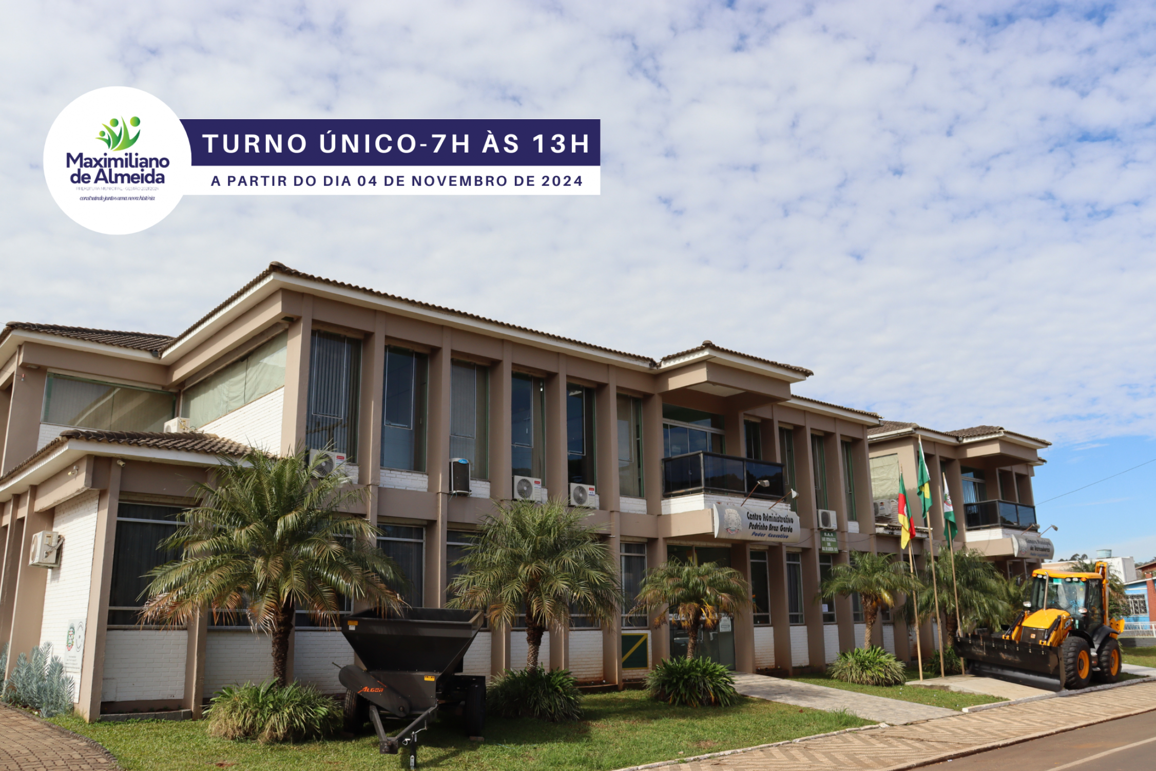 A Prefeitura de Maximiliano de Almeida informa que, a partir de 4 de novembro de 2024, todos os setores da administração municipal passarão a operar em turno único, das 7h às 13h. Essa medida abrange todas as áreas, com exceção das Secretarias de Saúde e de Educação, Desporto, Cultura e Juventude, além do Centro de Referência em Assistência Social (CRAS), que manterão seus horários habituais para assegurar o atendimento essencial à população.