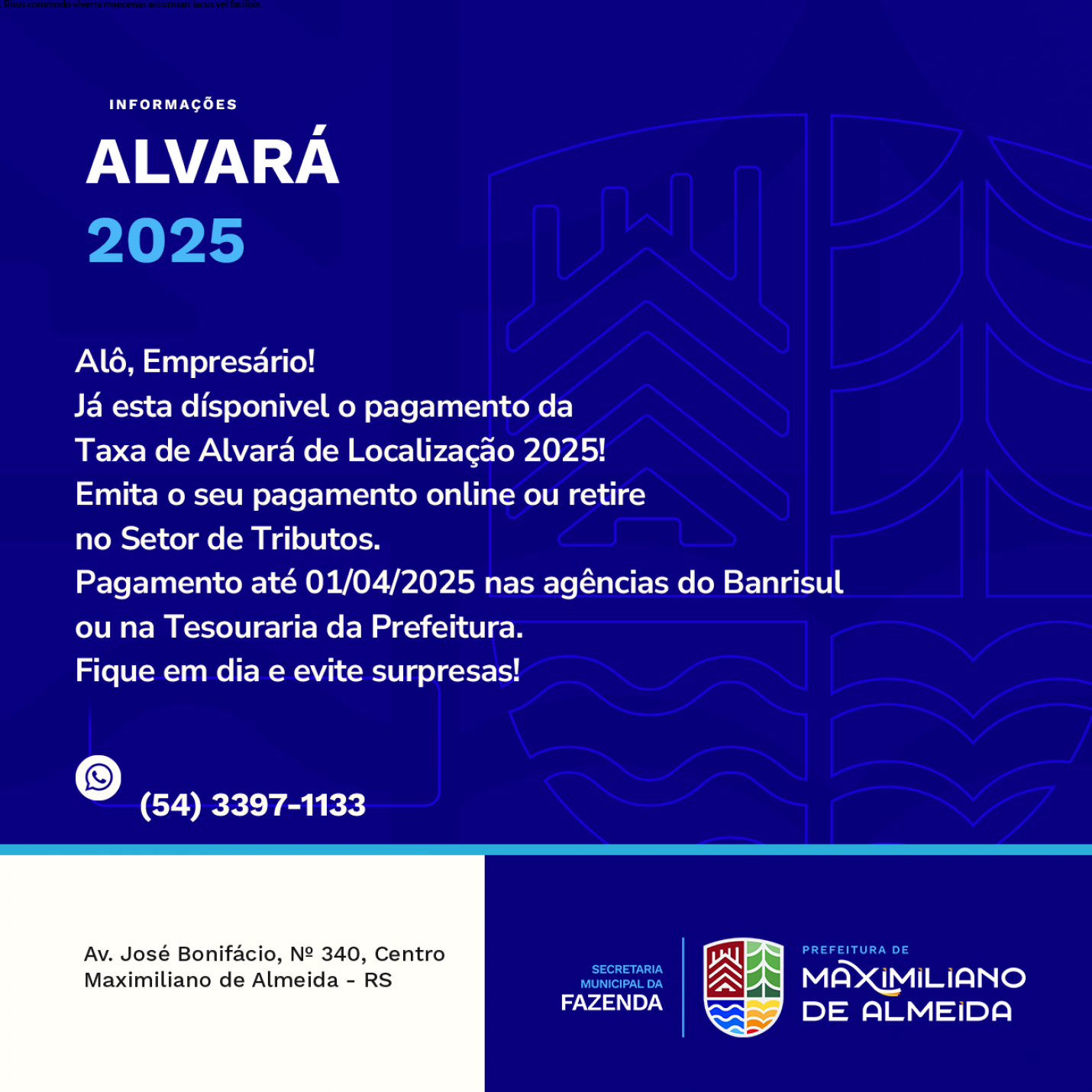 Lembre-se: o prazo para pagamento é até o dia 01/04/2025. O pagamento pode ser feito nas agências do Banrisul ou na Tesouraria da Prefeitura.