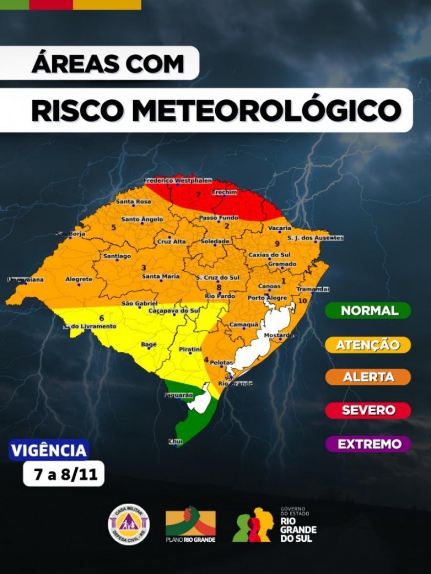 Na sexta-feira (7), a formação de um ciclone extratropical provoca temporais. Nas regiões Noroeste, Norte e Nordeste (em vermelho no mapa), há uma condição de tempestades mais severas, com ventos acima de 100 km/h de maneira generalizada, e potencial para tornados. Também pode ocorrer chuva intensa e granizo grande isolado em toda metade Norte do estado. Os acumulados oscilam entre 60 e 100 mm/dia, podendo atingir os 150 mm/dia na região Central. Esses acumulados devem ocorrer em um período de 6 a 12 h, entre a madrugada e início da tarde de sexta. Nas demais regiões, os volumes variam entre 10 e 80 mm/dia. As rajadas de vento oscilam entre 50 e 85 km/h no território gaúcho, e podem ultrapassar os 100 km/h entre o Litoral Médio e Norte e áreas próximas da Costa Doce.