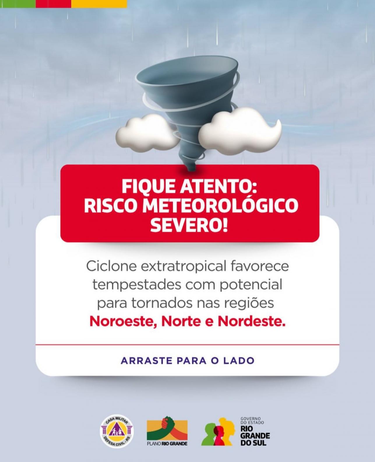 Defesa Civil do Rio Grande do Sul atualiza a previsão para os próximos dias: a formação de um ciclone extratropical pode provocar tempestades severas, com risco de tornados e rajadas de vento fortes nas regiões Noroeste, Norte e Nordeste. Também há risco de chuva volumosa, ventos acima de 100 km/h, granizo e descargas elétricas.