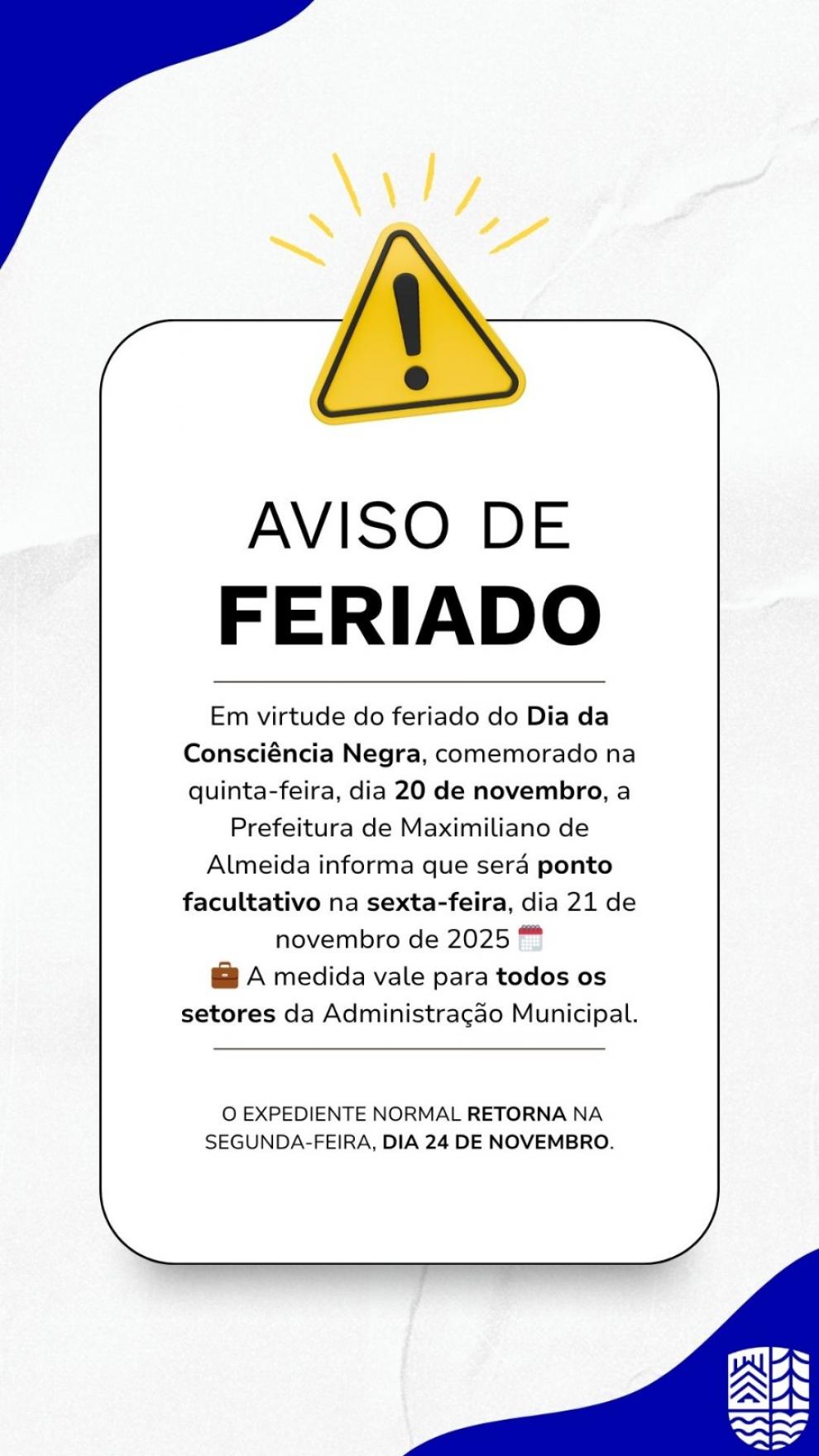 A Administração Municipal de Maximiliano de Almeida informa que, em razão do feriado da Consciência Negra, celebrado no dia 20 de novembro (quinta-feira), o feriado será prorrogado para o dia 21 de novembro (sexta-feira), conforme disposto no decreto municipal em anexo.