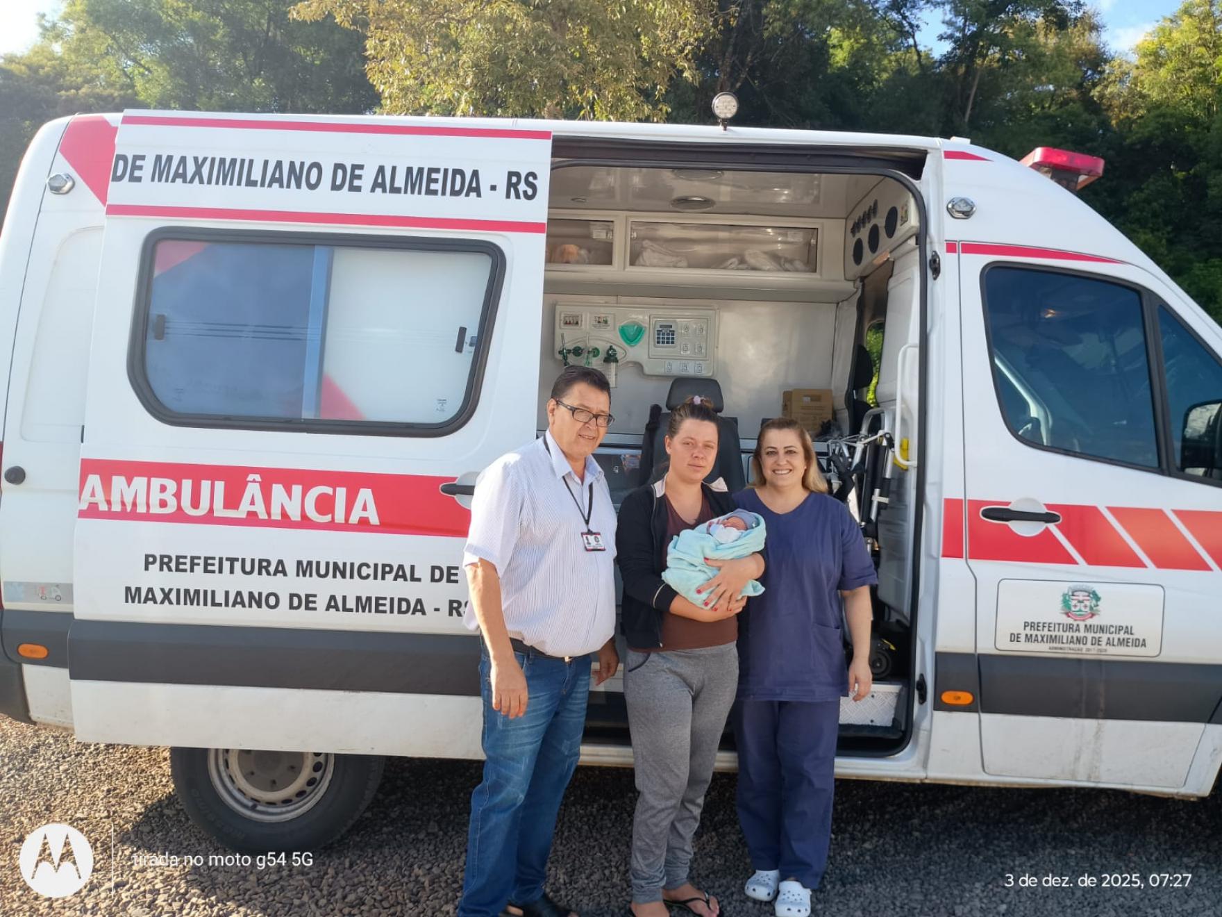 Na manhã do dia 1º de dezembro de 2025, uma ocorrência marcou de forma especial o trabalho da equipe de saúde de Maximiliano de Almeida. A gestante Letícia Ostrzyzek era conduzida ao hospital quando o parto evoluiu rapidamente, obrigando a equipe a parar na comunidade de Bom Parto. Dentro da ambulância, nasceu o pequeno Ângelo Ostrzyzek, saudável e forte.